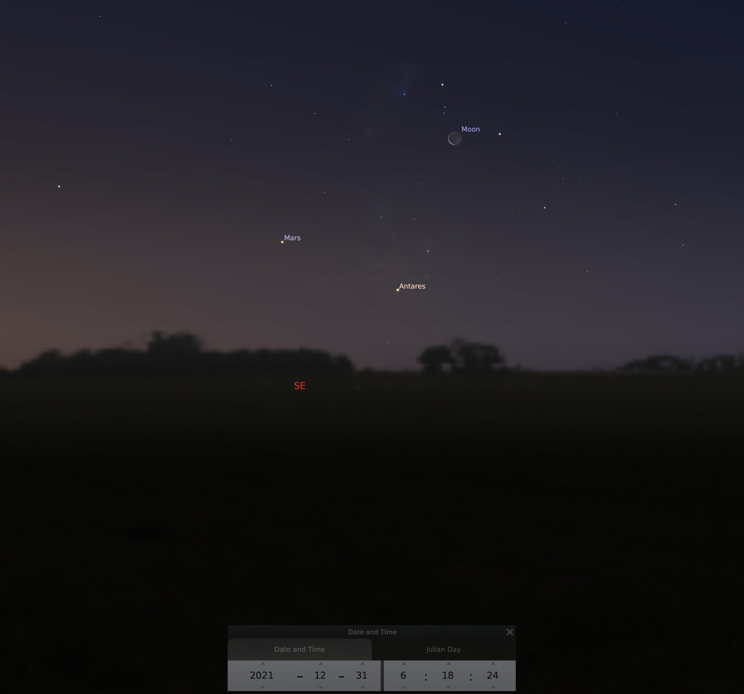 No a posledná zaujímavosť nastane zároveň v posledný deň roku 2021. V Silvestrovské ráno 31. decembra sa Mesiac dostane priamo do známeho súhvezdia Škorpión s jasnou hviezdou Antares. V blízkosti sa bude taktiež nachádzať slabučká planéta Mars. A mimochodom, prajeme Vám úspešné pozorovanie všetkých astronomických úkazov a čo najviac zdaru i v roku 2022! A že sa bude na čo tešiť! Malá ochutnávka nižšie: