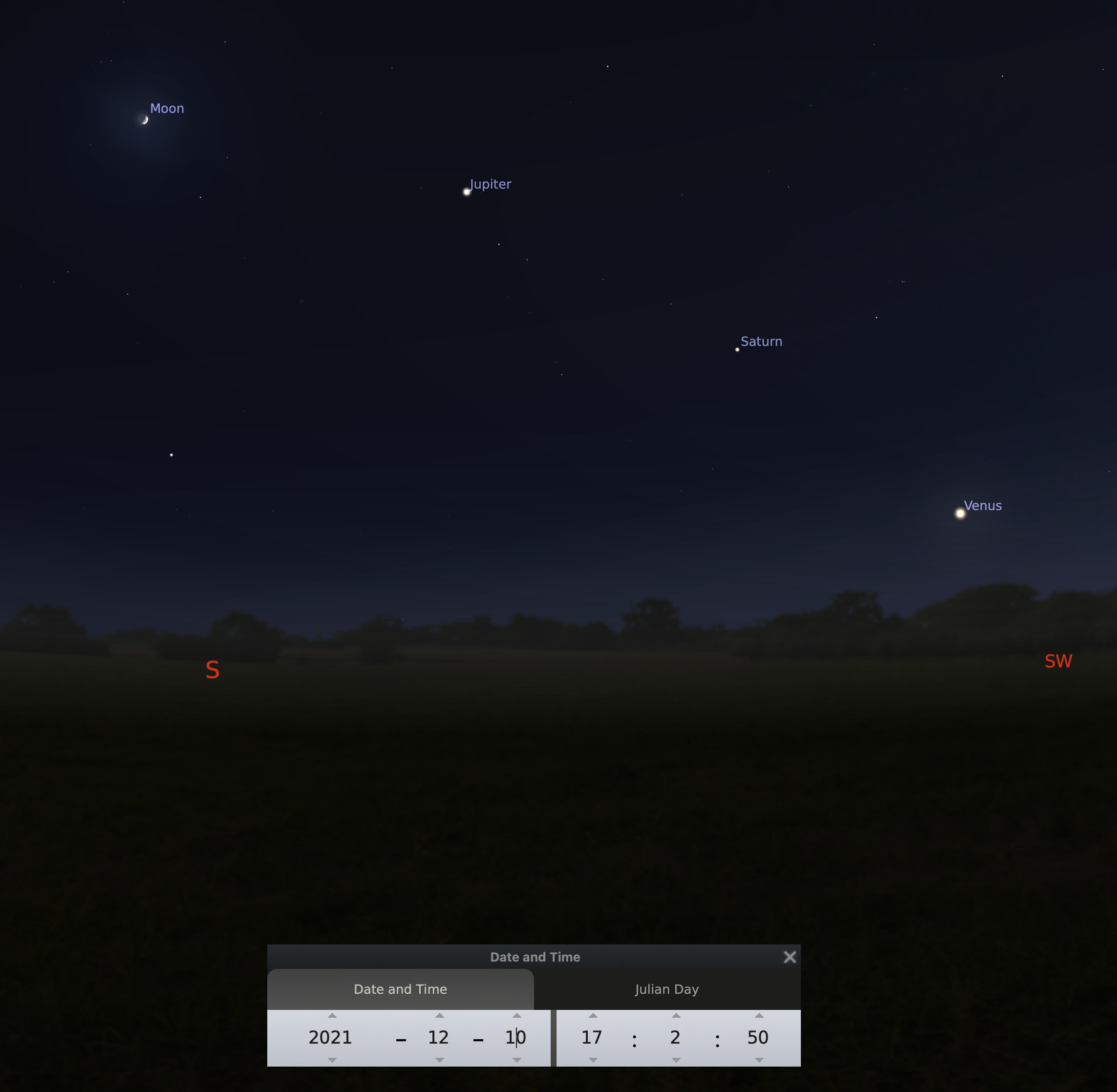 Druhý dátum, ktorý by ste z hľadiska konjunkcií mali brať v úvahu je 10. december. Mesiac sa vtedy dostane na jednu priamku k planétam Jupiter, Saturn a Venuša. Táto konjunkcia opäť poskytne námety na rôzne zaujímavé fotografické kompozície.