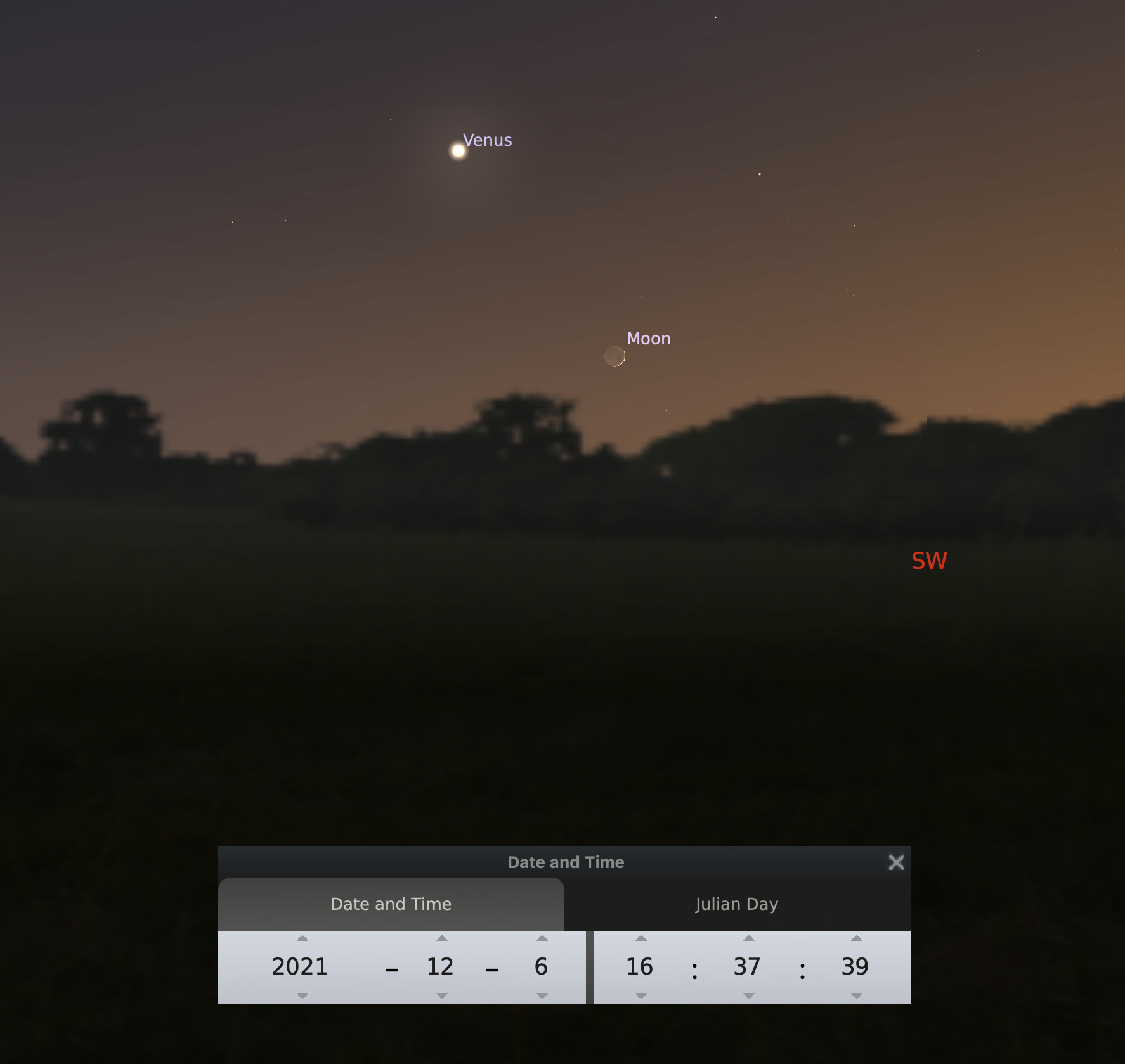 Prvá zaujímavá konjunkcia nastane 6. decembra hneď po západe Slnka. Vtedy sa tenučký kosáčik mladého Mesiaca v popolavom svite dostane do blízkosti jasnej Venuše.